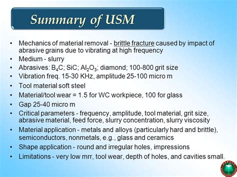 USM is a non-traditional machining process that is used to remove material from a workpiece. The process uses high frequency, low amplitude vibrations to remove material from the workpiece. USM has several advantages over traditional machining processes, including the ability to machine hard and brittle materials and produce a fine surface finish. However, it also has some disadvantages, including limited tool life and slow material removal rate. Several factors affect the material removal in USM, including the amplitude and frequency of the tool vibrations, slurry concentration, pressure of the slurry, and type of abrasive particles used.